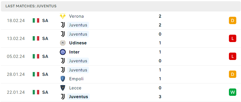 Phong độ đội bóng Juventus vs Frosinone