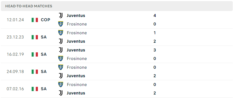 Thành tích đối đầu của Juventus vs Frosinone