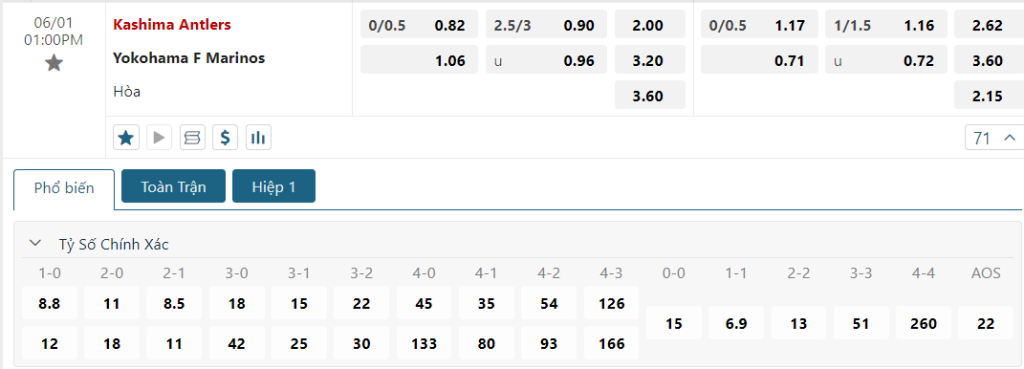 Bảng tỷ lệ kèo bóng đá trận đấu Kashima Antlers vs Yokohama F. Marinos