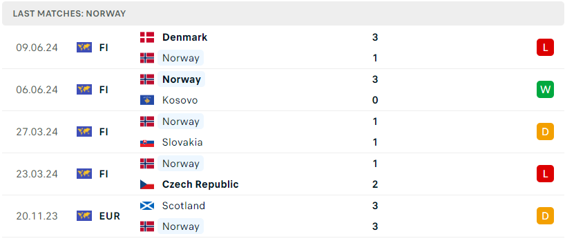 Bên kia, một cái tên khác cũng đã rất gần với ngày hội bóng đá lớn nhất châu Âu nhưng lại vụt mất cơ hội trong phút cuối là Na Uy. Tuy vậy, nhưng có thể thấy dưới sự dẫn dắt của HLV Stale Solbakken, đội tuyển này đã có những bước chuyển mình đáng kể trong vài năm trở lại đây. Trong 3 trận đấu giao hữu gần nhất, Na Uy thể hiện phong độ không quá ổn định khi giành 1 chiến thắng, 1 trận hòa và để thua 1 trận trước Đan Mạch. Trận đấu tới sẽ là cơ hội để Na Uy khẳng định vị thế tại League B.