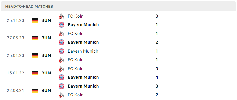 Thành tích đối đầu của Bayern Munich vs FC Koln