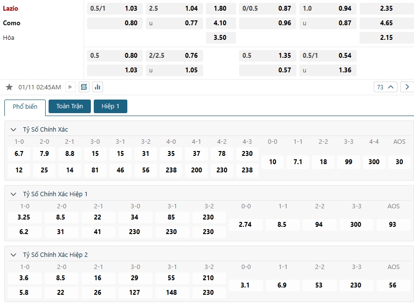 Kèo châu Âu cũng là sự chênh lệch lớn khi mức ăn của Lazio đang là 1.80 và đối thủ của họ Como đã là 4.10 , bấy nhiêu là đủ cho thấy chênh lệch đẳng cấp của cả hai, với ưu thế sân nhà, phong độ cao và lịch sử đối đầu vượt trội thì không có lý do gì để ngăn cản đoàn quân của HLV Maurizio Sarri tìm kiếm 3 điểm ở ngày ra quân.