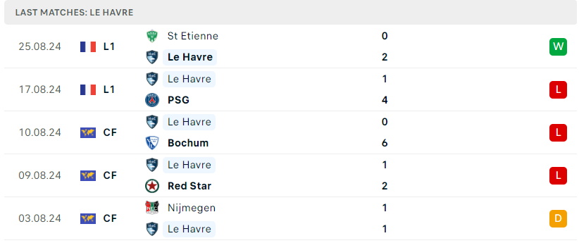 Le Havre sẽ có màn đón tiếp Auxerre trong khuôn khổ vòng thi đấu thứ 3 tại Ligue 1. Sau trận thua đậm 1-4 trước PSG trong trận ra quân, Le Havre đã ngay lập tức tìm lại sự tự tin với chiến thắng thuyết phục 2-0 trước tân binh Saint-Étienne. Đối diện với Auxerre, một tân binh khác, Le Havre chắc chắn sẽ đặt mục tiêu tiếp tục chuỗi trận tích cực để củng cố vị trí của mình trên bảng xếp hạng.