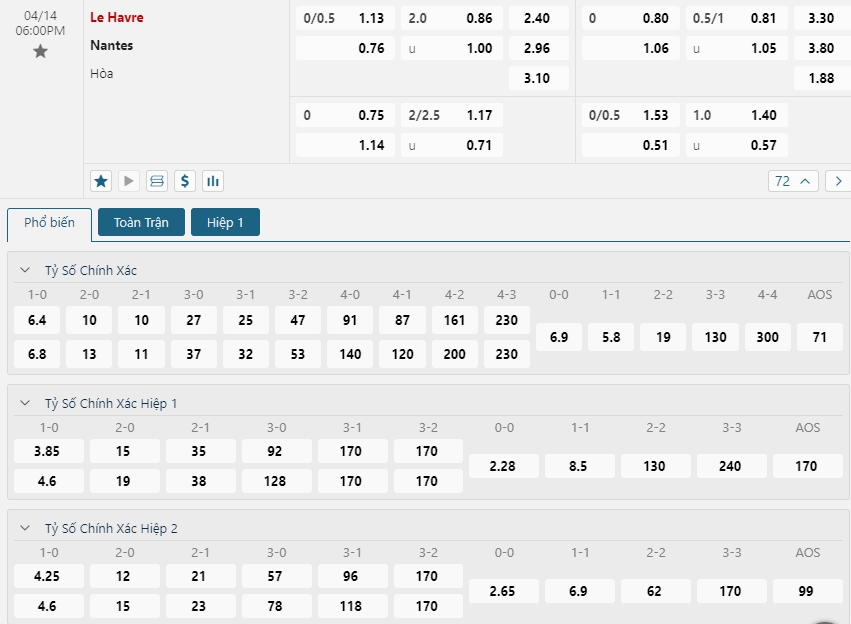 Kèo châu Âu cũng đang là sự ưu thế nhỏ cho chủ nhà khi mức ăn của Le Havre đang là 2.40 trong khi đó con số này của Nantes là 2.96. Chắc chắn đây là một thời điểm mà Nantes sẽ cần phải thể hiện được bản lĩnh của mình, việc vẫn đang duy trì được một phong độ khá tốt khi thi đấu xa nhà sẻ giúp cho họ dường như có thể mở ra các toan tính trước một Le Havre đang thi đấu bết bát ở giai đoạn vừa qua.