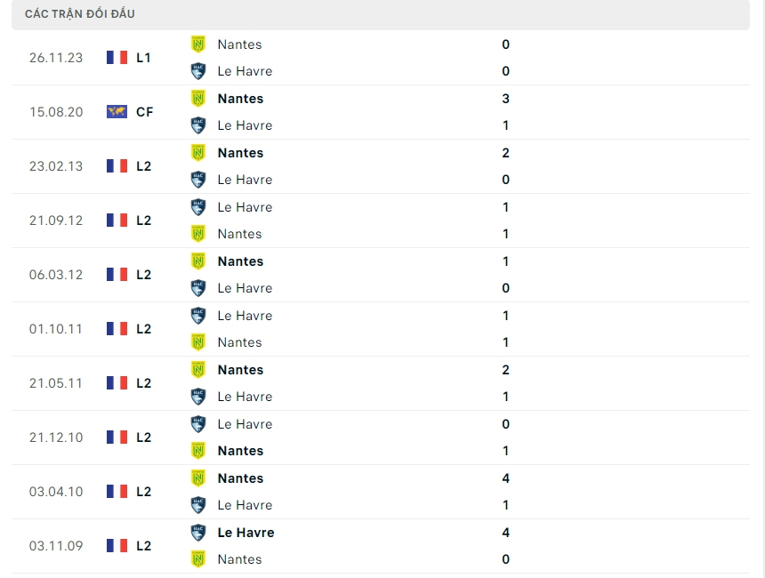Lịch sử thi đấu của Le Havre vs Nantes