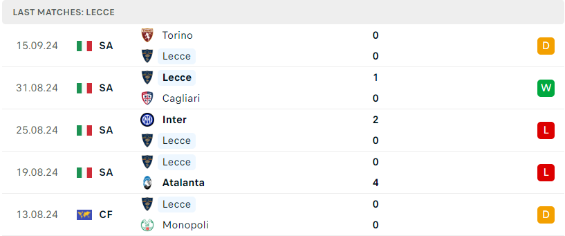Sau hai trận thua mở màn trước Atalanta và Inter Milan, Lecce đã ngay lập tức tìm lại sự tự tin với chiến thắng ấn tượng trước Cagliari và trận hòa trước Torino. Nhìn chung, thực lực của Lecce cũng đang cho thấy những sự tiến bộ ở mùa giải này và khi đối đầu với những đối thủ vừa sức, đội bóng vùng Apulia luôn thể hiện được sự lường. Sassuolo sau khi xuống hạng cũng đã dần đánh mất chính mình và trận đấu tới sẽ là cơ hội để Lecce tiếp nối mạch bất bại.