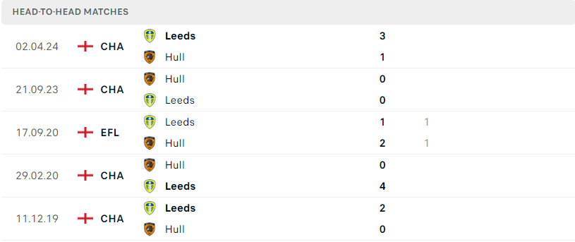 Thành tích đối đầu của Leeds Utd vs Hull City
