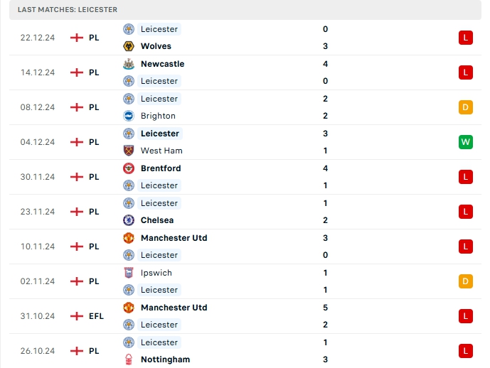 Leicester City vừa nhận thất bại trước Wolves, đây là trận thua thứ 2 liên tiếp của họ và cũng là thất bại thứ 9 sau 17 trận đấu, cùng với 5 hòa và 3 chiến thắng, có được 14 điểm và đang xếp vị trí thứ 17 trên BXH, hàng công của Leicester City có cho mình 21 bàn thắng cùng hàng thủ chơi tệ khi nhận 37 bàn thua, cả 5 trận vừa qua của Leicester City đều chạm mốc từ 3 bàn trở lên, trên sân nhà của mình Leicester City có được 11 bàn thắng cùng 15 bàn thua sau 9 trận đấu, cả 5 trận trên sân nhà vừa qua của Leicester City cũng vượt mốc 3 bàn.
