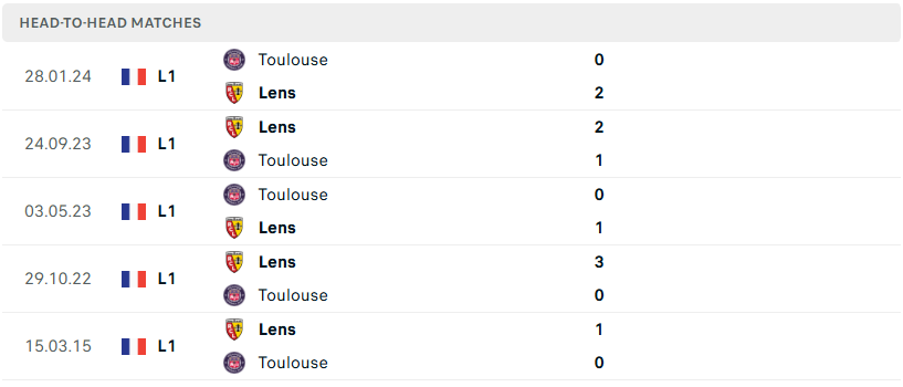 Thành tích đối đầu của Lens vs Toulouse