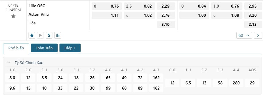Kèo châu Âu đang là sự ưu thế cho các cầu thủ chủ nhà khi mức ăn của Aston Villa đang là 1.66 trong khi đó con số này của Lille đã là 4.20. Ưu thế sân nhà sẻ giúp Aston Villa làm chủ thế trận nhưng họ sẻ không dễ dàng có được điều mình cần, khi lối đá của Lille ở thời điểm hiện tại rất ưa thích việc nhường quyền kiểm soát cho đối phương và chờ đợi thời cơ, một sai sót cũng sẻ khiến Aston Villa phải trả giá đắt, một kết quả hòa sẻ là hợp lý cho mà đụng độ này.