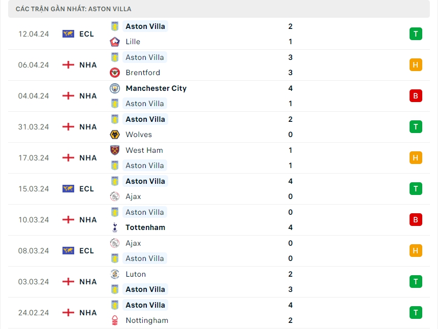 -Phong độ Aston Villa