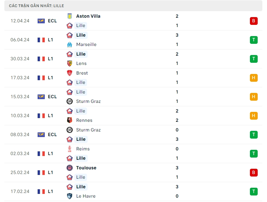 Phong độ đội bóng Lille vs Aston Villa