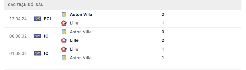 Lịch sử thi đấu của Aston Villa vs Lille