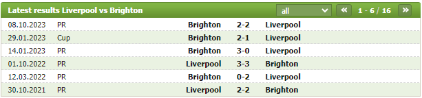 Lịch sử thi đấu của Liverpool vs Brighton