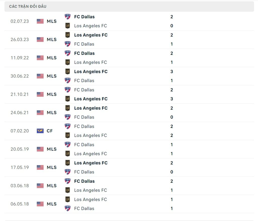 Lịch sử thi đấu của Los Angeles FC vs FC Dallas