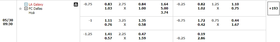 Bảng tỷ lệ kèo bóng đá trận đấu Los Angeles Galaxy vs FC Dallas
