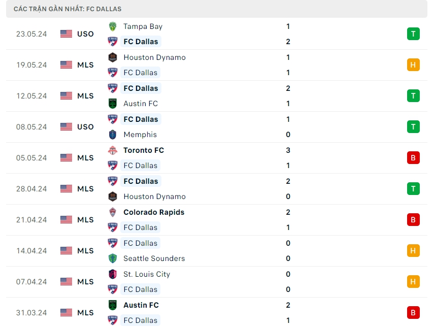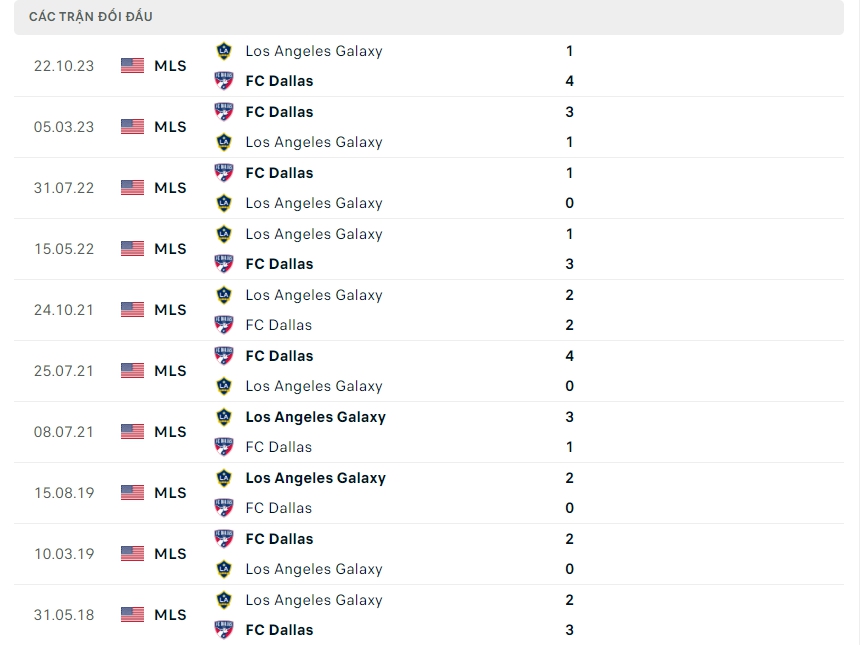 Lịch sử thi đấu của Los Angeles Galaxy vs FC Dallas