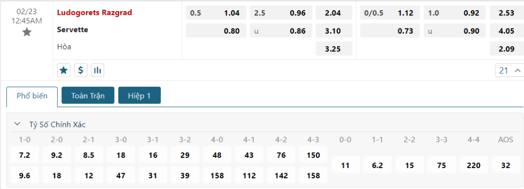 Kèo Châu Âu vẫn đang là sự nhỉnh hơn dành cho đội chủ nhà, khi mức ăn của họ đang là 2.04 trong khi con số này của các vị khách là 3.10. Nhìn chung, việc Servette vẫn liên tục ra sân tại giải quốc nội sẽ giúp họ có được cảm giác bóng tốt hơn so với Ludogorets, vì thế dù sở hữu lợi thế sân nhà và được đánh giá cao hơn nhưng Ludogorets cũng sẽ “tắt điện” trước lối đá lì lợm của đối thủ.