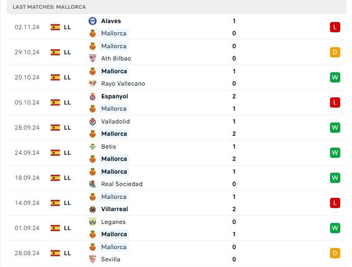 Mallorca vừa nhận thất bại 0-1 trước Alaves, đây là thất bại thứ 4 của họ sau 12 lượt trận, cùng với 5 chiến thắng và 3 hòa, có được 18 điểm và đang xếp vị trí thứ 8 trên BXH, hàng công của Mallorca mang về 10 bàn thắng cùng hàng thủ nhận 9 bàn thua, việc hàng thủ đang chơi tốt giúp Mallorca đang có được vị trí tốt trên BXH, 3/5 trận vừa qua của Mallorca khép lại không quá 2 bàn thắng, trên sân nhà của minh Mallorca mang về 4 bàn thắng và nhận 3 bàn thua sau 6 lượt trận, 4/5 trận đấu đó khép lại 90 phút không quá 2 bàn.