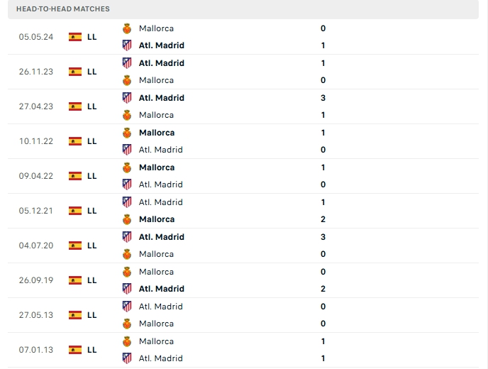 Ở lần gặp nhau gần nhất trong khuôn khổ lượt về mùa giải năm ngoái, khép lại với chiến thắng đầy khó nhọc cho các vị khách, và lần đụng độ này mọi chuyện sẻ tiếp tục không dễ dàng và với sự khó chịu đến từ chủ nhà Mallorca thì không dễ để Atletico Madrid tìm kiếm chiến thắng.
