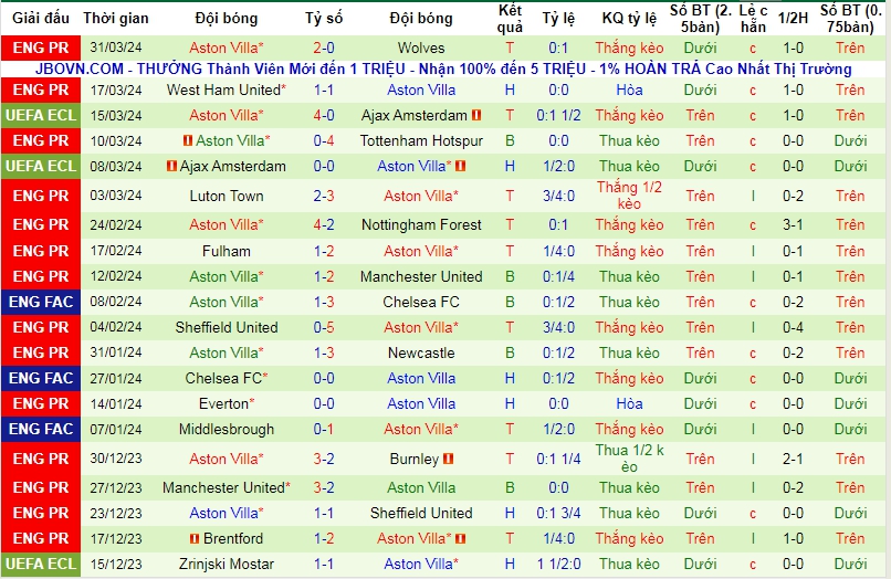 -Phong độ Aston Villa