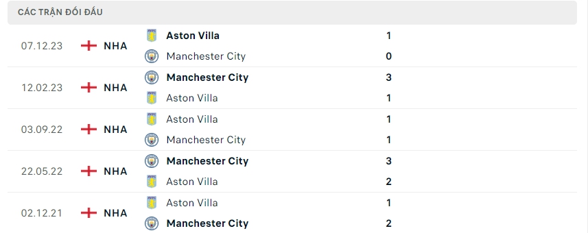 Có tổng cộng 5 lần Manchester City và Aston VILLA đã chạm mặt nhau gần nhất trên sân của Manchester City thì kết quả đều là những trận cầu tưng bừng bàn thắng, và The Citizens luôn tạo ra sự khác biệt khi có được cho mình chiến thắng, 4 trong 5 trận đấu đó Manchester City đều tạo ra chiến thắng với cách biệt.