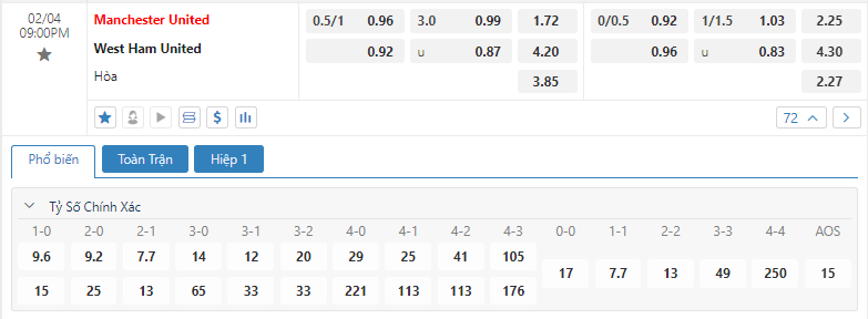 Bảng tỷ lệ kèo bóng đá trận đấu Manchester United vs West Ham