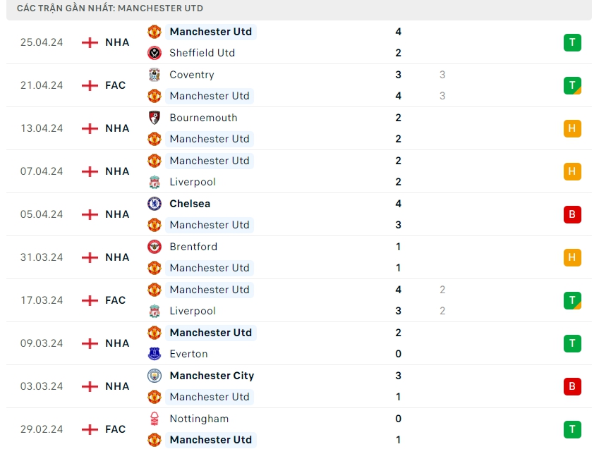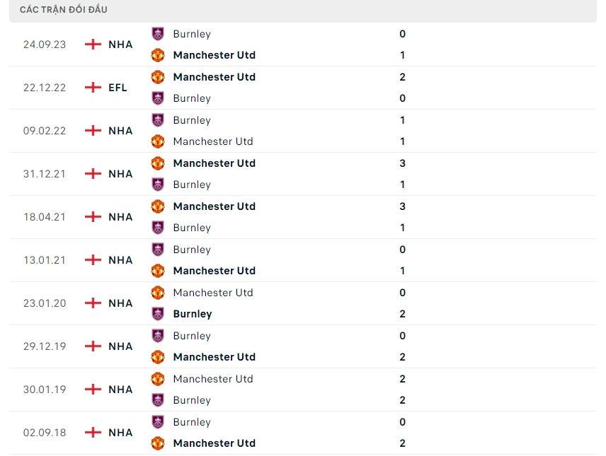 Lịch sử thi đấu của Manchester Utd vs Burnley