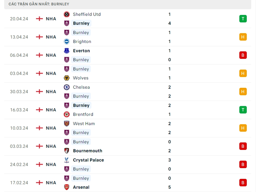 Trong khi đó một cái tên khác cũng đang thi đấu đầy chệch choạc và tỏ ra ngợp thở trong lần trở lại sân chơi hàng đầu xứ sở xương mù này là Burnley. Sau 34 lượt trận tập thể này cũng chỉ mang về vỏn vẹn 5 thắng lợi và 8 trận hòa và có đến 21 thất bại, cùng với một vị trí áp chót trên BXH. chỉ có được 1 chiến thắng ở 5 vòng đấu gần nhất chưa thể giúp Burnley cải thiện quá nhiều, hàng công thi đấu không quá xuất sắc, ngược lại hàng thủ đang là điểm yếu quá lớn khi để thủng lưới đến 69 bàn thua khiến Burnley đang gặp nhiều khó khăn ở mùa giải năm nay.,