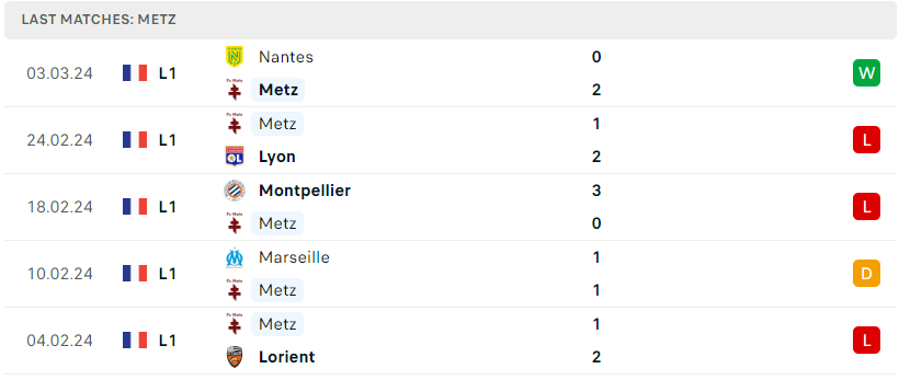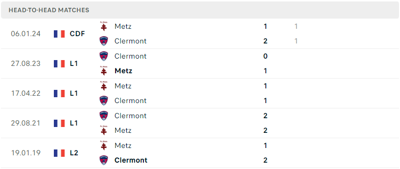 Nên nhớ rằng, trong cả 4 lần đụng độ gần nhất thì Metz cũng đã không phải nhận về bất kỳ thất bại nào trước Clermont. Một thống kê đủ để thấy sự khắc tinh của Metz dành cho Clermont. Sự khởi sắc cùng với lợi thế sân nhà sẽ là chất xúc tác cần thiết để tân binh có thể thuận lợi đánh bại đối thủ với tỉ số tối thiểu trong trận đấu sắp tới.