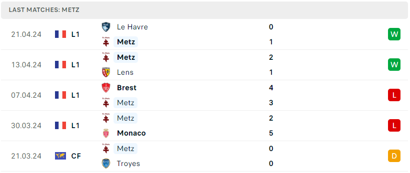 Sau khi gây bất ngờ với chiến thắng 2-1 trước Lens, tân binh Metz tiếp tục vùng vẫy một cách đầy mạnh mẽ và xuất sắc vượt qua Le Harve với tỉ số tối thiểu ít giờ trước. Với những điểm số quan trọng này thì đoàn quân Laszlo Boloni đã chính thức thoát khỏi nhóm cầm đèn đỏ và hiện đang nắm giữ cách biệt 1 điểm. Một khoảng cách không quá lớn và mọi thứ hoàn toàn có thể đảo chiều. Do đó, Metz cần phải tiếp tục thi đấu với tối đa sự quyết tâm, nếu vẫn muốn trụ lại sân chơi này.