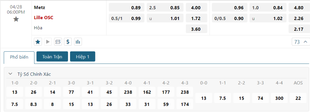 Điểm tựa mang tên sân nhà là chưa đủ để Metz nhận được bất kỳ sự ưu ái nào trong kèo đấu này, thay vào đó Lille mới đang là tập thể được đánh giá cao hơn với mức giá trên sàn giao dịch là 0.75. Mặc dù phong độ và sự quyết tâm của Metz là rất lớn vào lúc này, thế nhưng trước một tập thể già dặn và đầy bản lĩnh như Lille thì thật khó để tân binh có thể làm nên được quá nhiều điều đặc biệt. Chưa kể, phong độ tại Ligue 1 của Les Dogues cũng là cực tốt khi họ đã đang bất bại đến 6 trận đấu liên tiếp và hơn đối thủ đến 11 bậc xếp hạng. Không những vậy, sân nhà chưa bao giờ là điểm tựa quá vững vàng của Metz khi họ chỉ thắng 2/8 trận đấu gần nhất và thậm chí đã thua đến 2/3 lần tiếp đón Lille. Chính vì sự vượt trội này, hoàn toàn có thể đặt niềm tin vào các vị khách trong kèo đấu Châu Á.