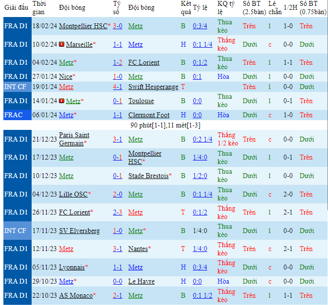 Trong khi đó với Metz, thảm bại 0-3 trước Montpellier như một sự tất yếu khi mà chuỗi phong độ tệ hại đang khiến cho đội bóng này lún rất sâu ở Ligue 1 năm nay. Họ vừa đánh dấu vòng đấu thứ 9 liên tiếp cho mình mà không thể tìm thấy bất kì một trận thắng nào tại giải đấu. Sự tồi tệ quá lớn khiến cho cơ hội vươn lên của Metz ngày càng trở nên ít đi khi mà họ đã kém khu vực an toàn đến 5 điểm hiện tại. Có lẽ màn tiếp đón Lyon sắp tới vẫn sẽ là áp lực rất lớn dành cho họ. Màn so tài sẽ là đôi chút sự lấn lướt đến từ các vị khách và khả năng cũng sẽ có nhiều bàn thắng xuất hiện.