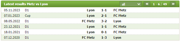 Lịch sử thi đấu của Metz vs Lyon