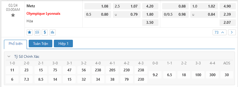 Kèo châu Âu cũng đang là sự ưu thế cho các vị khách khi mức ăn của Lyon đang là 1.80 trong khi đó con số này của Metz đã là 4.20. Một trận đấu mà tương quan về mặt chất lượng nhân sự cùng với đó là màn trình diễn có phần trái ngược nhau sẽ khiến cho cán cân hoàn toàn nghiêng về phía Lyon ở thời điểm này. Nhiều khả năng họ sẽ là đội bóng có được 3 điểm trước Metz trong kèo đấu sắp tới.