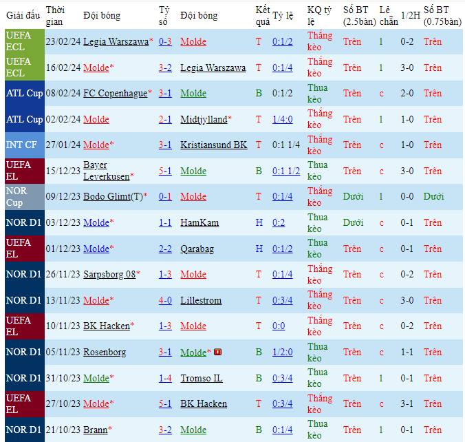 Kèo châu Âu lại đang là sự ưu thế nhỏ cho các vị khách khi mức ăn của Club Brugge đang là 2.43 trong khi đó con số này của Molde đã là 2.51. Sẽ là một trận đấu với thế trận tương đối giằng co khi cả hai đội sẽ sẵn sàng chơi sòng phẳng với nhau để tìm kiếm kết quả có lợi cho mình. Và với các lợi thế nhất định thì Club Brugge nhiều khả năng vẫn sẽ là cái tên có được niềm vui sau cùng.