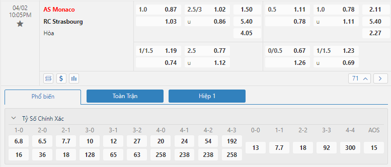 Kèo châu Âu cũng đang là sự ưu thế cho đội chủ nhà khi mức ăn của Monaco đang là 1.50 trong khi đó con số này của Strasbourg đã là 5.40. Một khoảng thời gian vô cùng khó khăn và hơn lúc nào hết Monaco sẽ cần phải có được sự quyết tâm vươn lên cùng với đó là những giải pháp để đưa mình trở lại với guồng quay hiện tại. Các lợi thế đang có sẽ là cơ sở để họ có thể nghĩ đến một chiến thắng trước Strasbourg ở trận đấu tới.