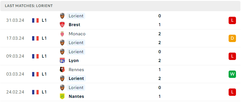 Ngược lại, Lorient lại đang thi đấu cực kỳ thất vọng ở mùa giải năm nay, thống kê cho thấy sau 27 vòng đấu nhưng tập thể này cũng chỉ mới mang về vỏn vẹn 26 điểm và với điểm số ít ỏi này thì binh đoàn Le Bris đang là một trong những cái tên có nguy cơ lớn phải xuống hạng. Chỉ sau một mùa giải, từ một tập thể cán đích ở nửa trên BXH Lorient đang sa sút và trượt dốc một cách mất kiểm soát. Sự yếu kém này chắc chắn sẽ còn tiếp diễn và trận đấu tới sẽ là thách thức lớn nữa đối với họ.