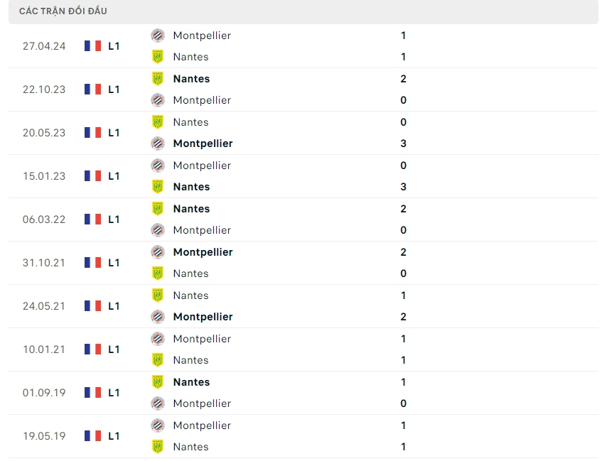 Montpellier và Nantes ở lần đụng độ gần nhất khép lại với tỷ số hòa 1-1, và ở trận đấu tới đây mọi thông số điều hướng đến một trận đấu cân bằng, khi mà hàng công không được đánh giá cao ở những trận đấu vừa qua và với lối chơi chặt chẻ thiên về phòng thủ thì trận đấu tới khả năng khép lại với tỷ số hòa.