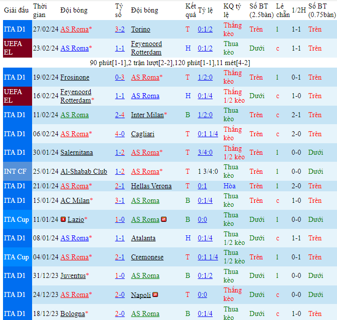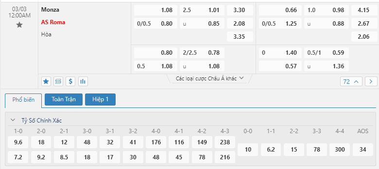 Kèo châu Âu cũng đang là sự ưu thế nhỏ cho các vị khách khi mức ăn của AS Roma đang là 2.08 trong khi đó con số này của Monza đã là 3.30. Chắc chắn đây là một thời điểm mà AS Roma sẽ cần phải thể hiện được bản lĩnh của mình, việc vẫn đang duy trì được một phong độ rất tốt giúp cho họ dường như có thể mở ra các toan tính trước một Monza đầy khó chịu và tìm kiếm lợi thế ở trận đấu sắp tới.