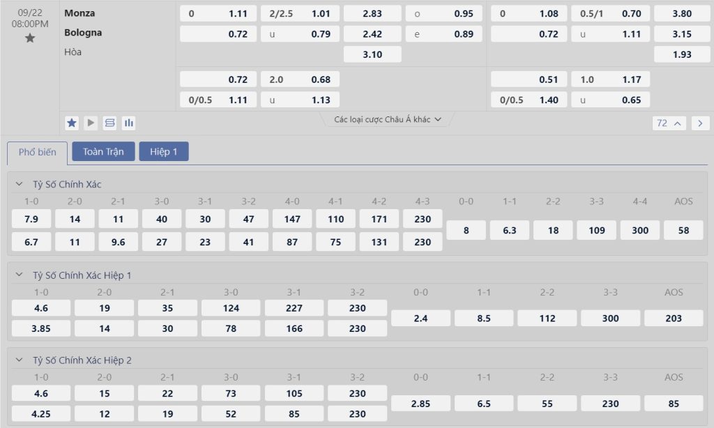Lợi thế sân nhà là không đủ giúp Monza thu hẹp khoảng cách về trình độ cũng như được xếp “chung mâm” với những người đông nghiệp bên phía Bologna. Trên sàn giao dịch châu Á, nhà cái niêm yết mức kèo khách chấp 0.25 trái. Thực tế thì đây là mức kèo mà những người cầm cân nảy mực dường như đang đánh giá cao một trận hòa hơn là chiến thắng của các học trò HLV Vincenzo Italiano. Monza vừa một lần nữa chứng tỏ họ không phải đối thủ dễ bị đánh bại dù cũng chia tay HLV trưởng mùa hè vừa qua khi cầm hòa Inter trong thế dẫn trước. Tính ra từ khi kết thúc chiến dịch 2023/24, thầy trò Nesta chỉ thua 3/11 trận trên mọi đấu trường – thống kê không hề tệ. Trong khi đó ở phía bên kia, chiến thắng tại giải VĐQG dường như vẫn đang lẩn tránh Bologna và mới đây, đại diện vùng Emilia-Romagna phải rất chật vật mới giật được 1 điểm từ tay tân binh Como.