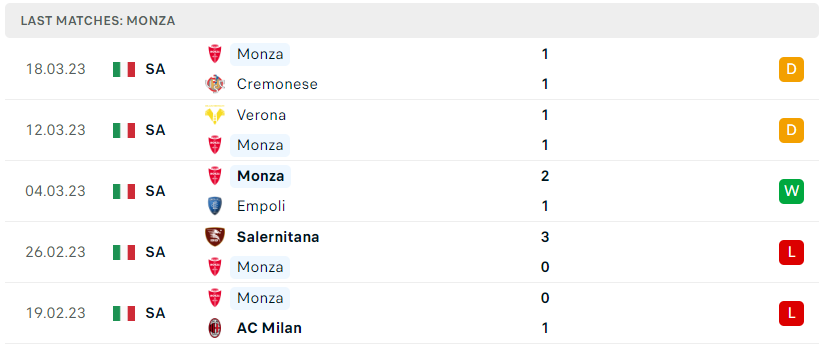 Màn trình diễn của Monza trong những vòng đấu gần đây là không hề tệ một chút nào, bằng chứng là việc đoàn quân của HLV Raffaele Palladino đang sở hữu chuỗi 3 trận bất bại liên tiếp. Thành quả của việc này là Monza đang thật sự quay trở lại mạnh mẽ trên BXH. Hiện tại, thầy trò HLV Raffaele Palladino đã tạo ra cách biệt đến 15 điểm so với nhóm cầm đèn đỏ. Mặc dù chỉ là tân binh ở mùa bóng năm nay nhưng đoàn quân của HLV Raffaele Palladino nhanh chóng chứng minh được thực lực và trình độ của mình. Dẫu vậy, nhưng đối đầu với Lazio chưa bao giờ là một thử thách dễ, vì vậy họ cần phải có những sự chuẩn bị kỹ lượng trong trận đấu sắp tới.