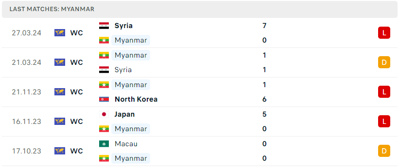 Phong độ đội bóng Myanmar vs Nhật Bản