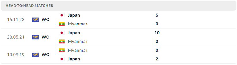 Trong cả 3 lần đụng độ gần nhất thì đội tuyển Nhật Bản luôn cho thấy sự vượt trội bằng những chiến thắng áp đảo. Trước trận thắng 5 sao vào tháng 11 năm ngoái, những chiến binh Samurai thậm chí còn hủy diệt đối thủ với tỉ số 10-0 tại vòng loại World Cup 2022. Quá nhiều những sự khác biệt và chính những điều đó sẽ tiếp tục nhấn chìm Myanmar, bất chấp trận đấu chỉ mang tính thủ tục.