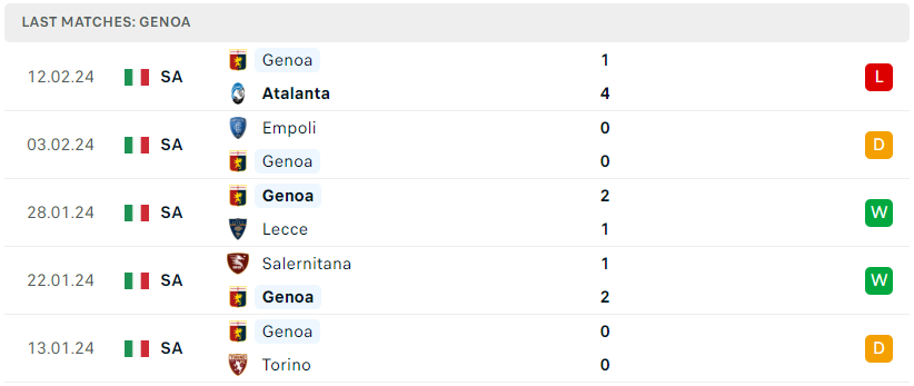 Trong khi đó với Genoa, sau cùng thì chuỗi 8 trận bất bại liên tiếp của tân binh cũng đã bị chặn lại sau thất bại múi mặt trước Atalanta ở vòng đấu trước. Mặc dù vậy nhưng nhìn chung màn trình diễn của đoàn quân Alberto Gilardino tính đến hiện tại là cực kỳ đáng khen với vị trí thứ 12 trên BXH. Nếu cứ tiếp tục thi đấu với phong độ này thì tin chắc rằng Genoa sẽ còn tiếp tục tiến bộ hơn trong tương lai. Chuyến hành quân đến Napoli sắp tới đây được xem là liều thuốc thử cần thiết dành cho họ.