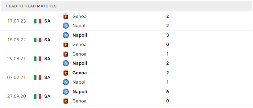 Mặc dù Napoli mới chính là tập thể đang nhận được sự ủng hộ từ lịch sử khi họ đã thắng 3/5 lần so tài gần nhất, tuy nhiên đó là câu chuyện khi của những mùa giải trước và thực tế với sự ổn định của Genoa cùng với sự cập rập của Napoli thì sự chênh lệch giữa đôi bên sẽ là không quá nhiều. Lợi thế sân nhà là chưa đủ để Partenopei có thể hạ bệ đối thủ trong lần đối đầu này.