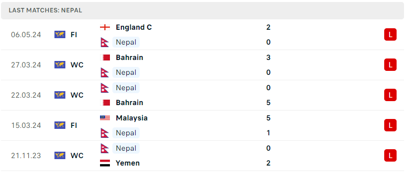 Vượt qua vòng sơ loại để có mặt tại vòng loại này được xem là một thành công vượt ngoài mong đợi của Nepal, khi sở dĩ họ luôn là một đội bóng bị đánh giá thấp và không nhiều lần vượt qua được vòng sơ loại tại các chiến dịch VL World Cup. Việc phải đụng độ UAE, Yemen hay Bahrain quả thật là nhiệm vụ quá sức dành cho Nepal và sau 5 lượt đấu họ chưa mang về được bất kỳ điểm số hay bàn thắng nào. Nhiêu đó là đủ để thấy được sự kém cỏi của tập thể này và thứ chờ đợi họ ở lượt đấu cuối không gì khác ngoài thất bại.