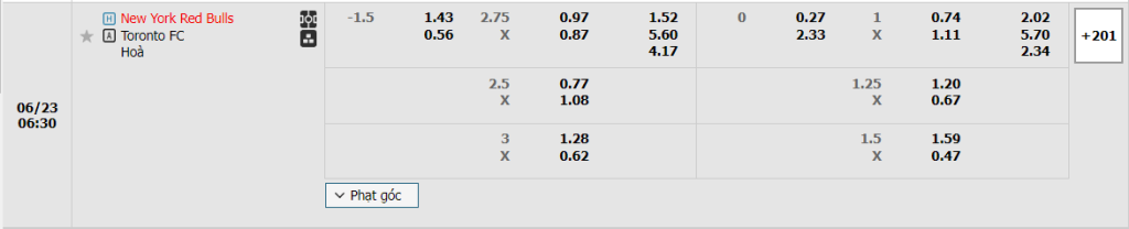 Bảng tỷ lệ kèo bóng đá trận đấu New York Red Bulls vs Toronto