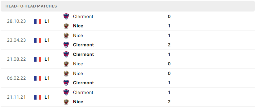 Thành tích đối đầu của Nice vs Clermont