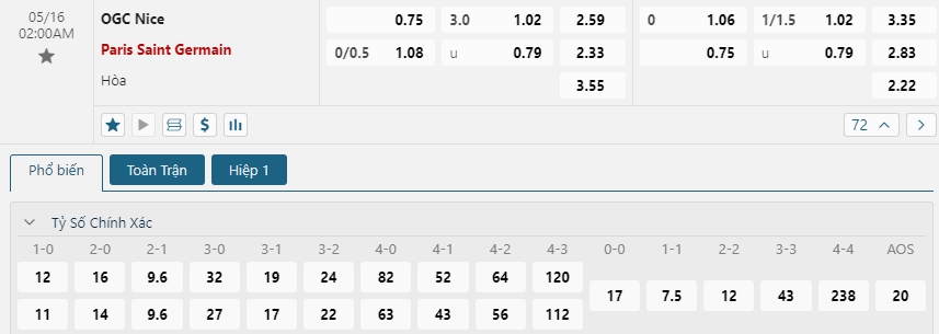 Kèo Châu Âu vẫn đang là sự ưu ái nhỏ cho các cầu thủ PSG, khi mức ăn của họ là 2.33 và con số này của chủ nhà Nice đang là 2.59. Chênh lệch là không quá lớn, Ưu thế sân nhà dù phải đối đầu với đối thủ được đánh giá cao hơn nhưng ở tình cảnh hiện tại Nice hoàn toàn có thể tạo nên bất ngờ và có được cho mình chiến thắng trong trận đấu tới khi mà ở trận lượt đi họ cũng xuất sắc đánh bại PSG 3-2 ngay trên sân đối phương.